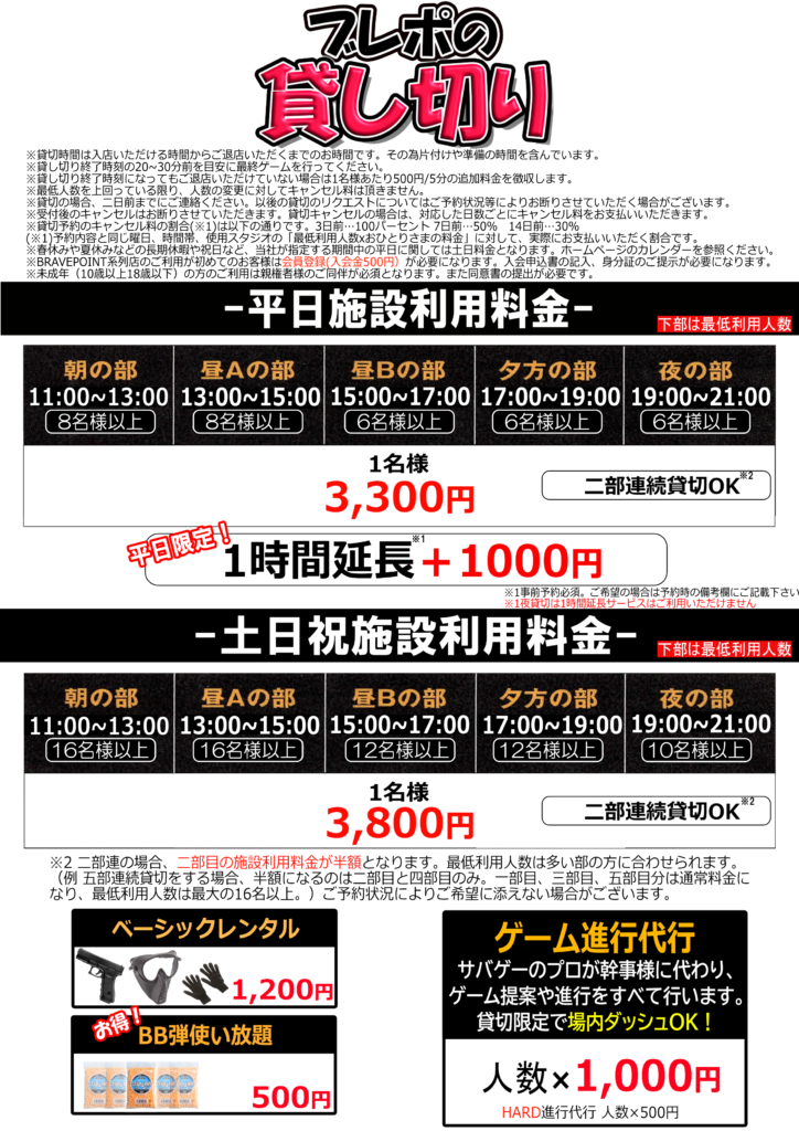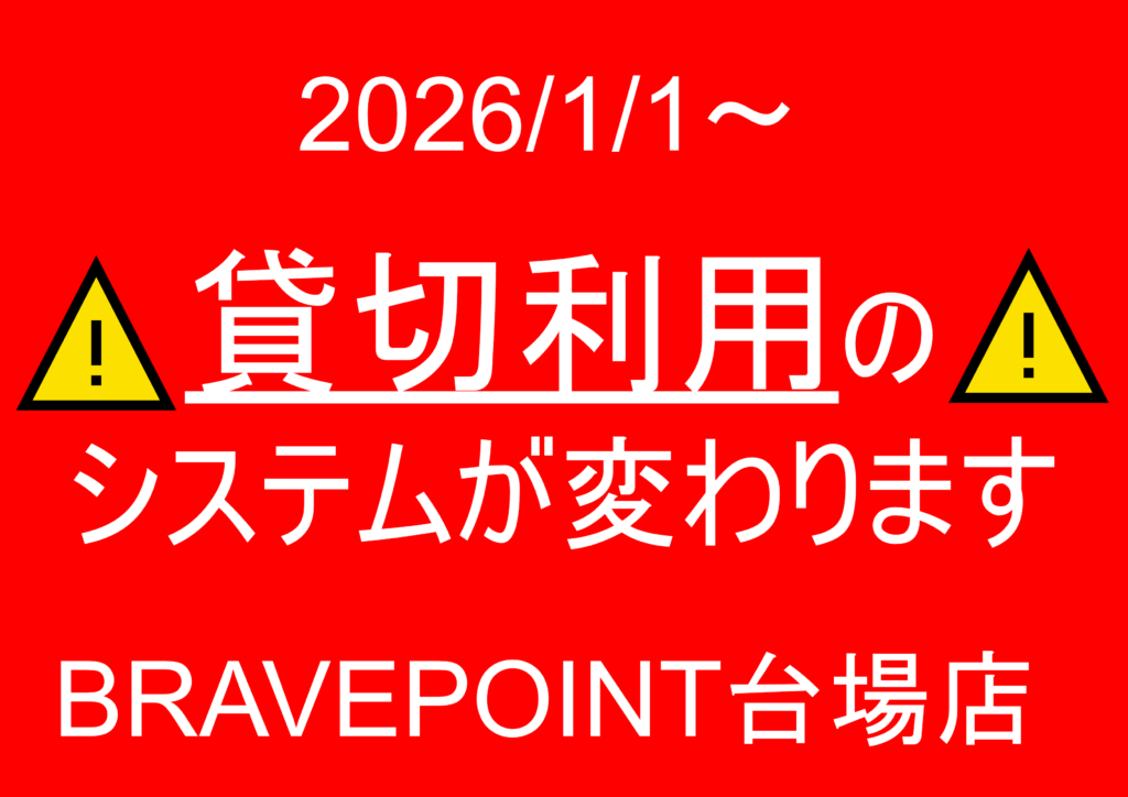 2026/1/1より、BRAVEPOINT台場店の貸切時間、料金等が変更となりますのでご案内でございます。