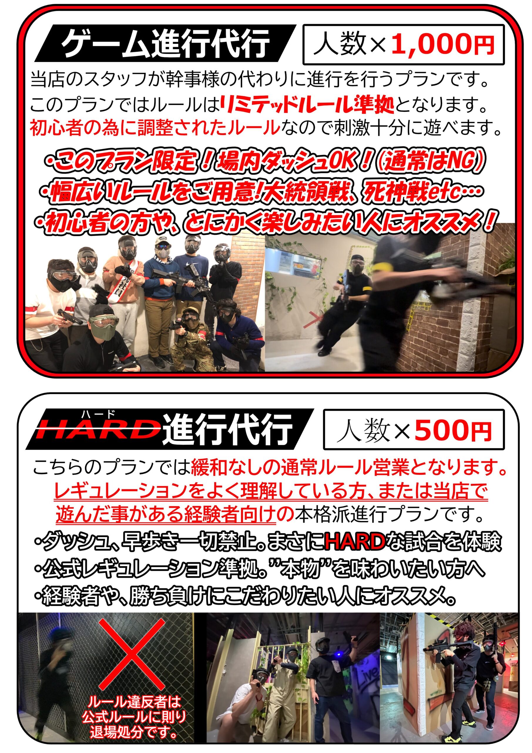 もちろんサバゲー経験者がグループにいる場合はその方がゲーム進行を行えば「ゲーム進行代行」は必要ございません。